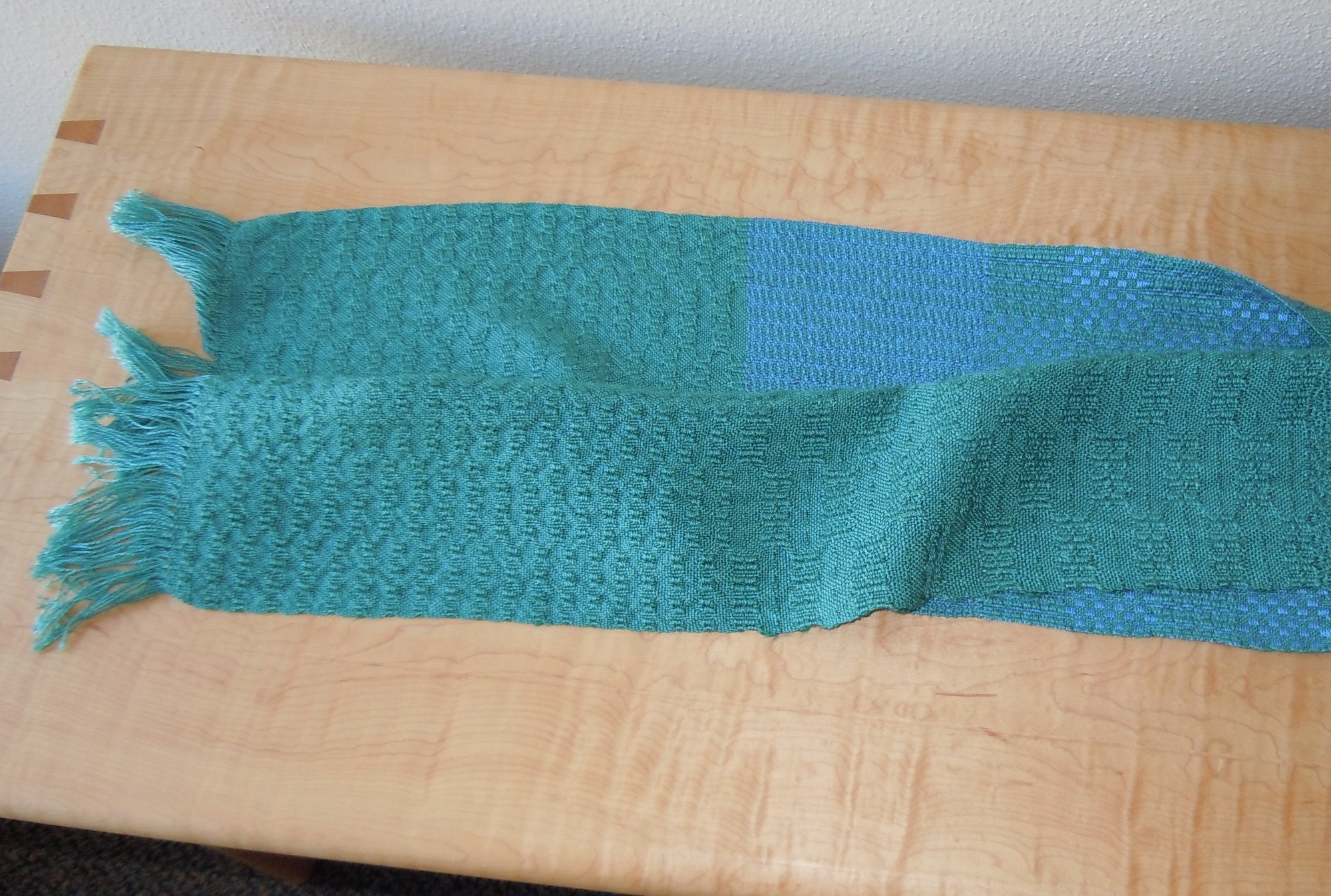 M's and O's Scarf. The weave structure of this scarf is actually a Finnish variation of M's and O's, called Leppaliinakangasta. It is easy, but interesting to weave. The scarf in the picture is a sampler scarf with the many different ways of treadling shown; you may decide to weave just one of the sections over and over. Made of Tencel.