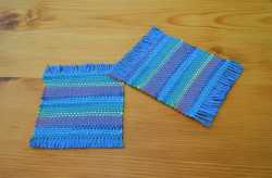 Mug Rugs for Beginners. Weaving these little rugs for mugs, otherwise known as coasters, is a great way to practice warping the loom. The warp is heavy cotton in one color, and the weft is variegated yarn in the same cotton so the stripes will happen automatically. You will be able to weave as many mug rugs as you have time for.